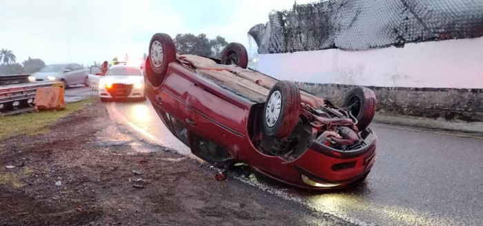 | Huiloapan de Cuauhtémoc, Ver.- (AVC) La mañana de este jueves, un automóvil terminó volcado a un costado del destacamento de la Guardia Nacional en la Autopista 150D Puebla–Orizaba, luego de que su conductor perdiera el control al tomar el retorno del kilómetro 268 bajo condiciones de pavimento resbaladizo por la lluvia matinal. El percance ocurrió alrededor de las 7:30 horas, cuando el Volkswagen Pointer rojo circulaba con exceso de velocidad pese a la llovizna que mantenía el asfalto húmedo. La combinación de la precipitación, la falta de pericia y la velocidad inmoderada provocaron que el vehículo derrapara y se volcara de manera aparatosa. A pesar de lo espectacular del accidente, las autoridades confirmaron que no hubo personas lesionadas ni fallecidas, únicamente daños materiales y el cierre momentáneo del retorno. Paramédicos de CAPUFE y elementos de la Guardia Nacional División Carreteras arribaron al sitio para valorar la situación y apoyar en las labores de seguridad. El vehículo siniestrado fue retirado por personal de grúas para permitir el restablecimiento total de la circulación, además de quedar a disposición para el deslinde de responsabilidades. Las autoridades exhortaron a los automovilistas a extremar precauciones debido a las condiciones climáticas que prevalecen en la zona de ascenso y descenso de la vía rápida 2100 México- Veracruz y viceversa.