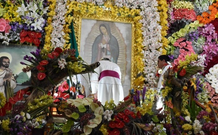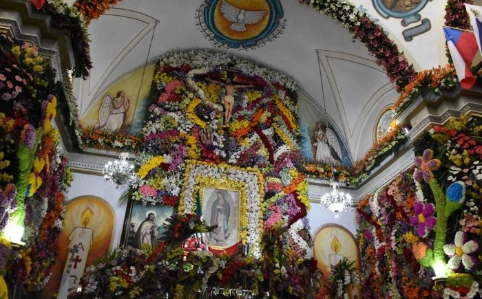 La Perla, Ver.- (AVC) Con una procesión sobre tapetes de aserrín y una misa solemne en la Parroquia de Santa María Virgen de Guadalupe, la cual fue forrada con millones de flores de la zona serrana, dieron inicio las fiestas patronales de La Perla. Al mediodía inició la procesión sobre la Avenida Principal o Independencia esquina La Palma, la cual fue acompañada por la banda de viento y cientos de fieles católicos hasta llegar a la Parroquia que fue vestida con rosas, orquídeas, alcatraces y demás flores La devoción por la Morenita del Tepeyac se hizo presente y el Obispo Eduardo Cervantes Merino a su paso dio la bendición a la feligresía, quienes llevaban consigo su imágenes de la Virgen Morena o a sus pequeños que iban vestidos de "inditos e inditas" simbolizando la aparición que hizo a San Juan Diego hace 491 años pidiendo la edificación de su "Casita". Al llegar a la entrada principal realizó la aspersión de agua bendita a los asistentes y posteriormente a los arreglos florales que vestían la parroquia; posteriormente dio inicio a la eucaristía en la que previamente se llevó a cabo la colocación de la rosa blanca a cargo de la joven de la comunidad que fue elegida para este fin.