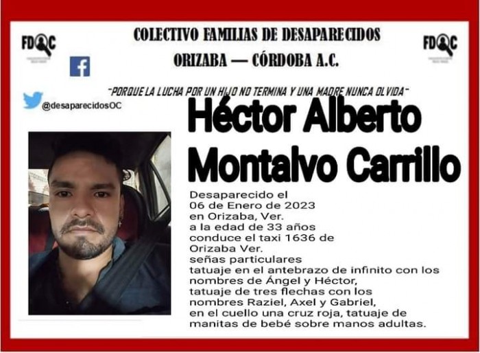 Orizaba, Ver.- (AVC) Un taxista de la Ciudad de Orizaba, fue reportado como desaparecido por el Colectivo de Familias de Desaparecidos en la Zona Córdoba-Orizaba, luego de que perdió completa comunicación con su familia desde el viernes 06 de enero del presente. El ruletero identificado como Héctor Alberto Montalvo Carrillo de 33 años, desapareció cuando tripulaba el taxi 1636 de la Ciudad de Orizaba. Debido a que su familia teme por su integridad física ya que podría ser víctima de la comisión de un delito, ha solicitado el apoyo de la ciudadanía en general para su inmediata ubicación. El masculino cuenta con señas particulares como: un tatuaje en el antebrazo de infinito con los nombres de Ángel y Héctor; un tatuaje de tres flechas con los nombres Raziel, Gabriel y Axel; en el cuello una cruz roja y un tatuaje de una manitas de bebé sobre manos adultas. Se espera que las próximas horas, la familia interponga una denuncia ante la Fiscalía Especializada en Personas Desaparecidas de Orizaba, para que se inicie con su inmediata ubicación y localización.