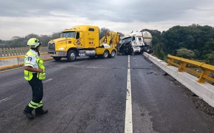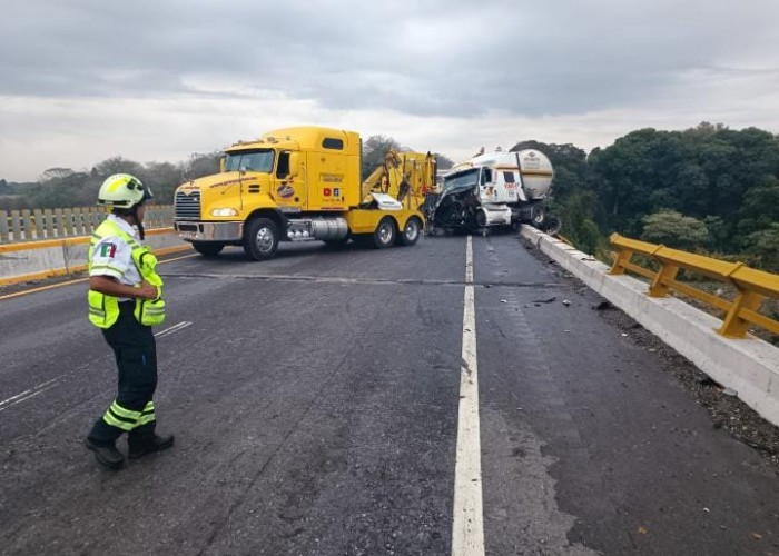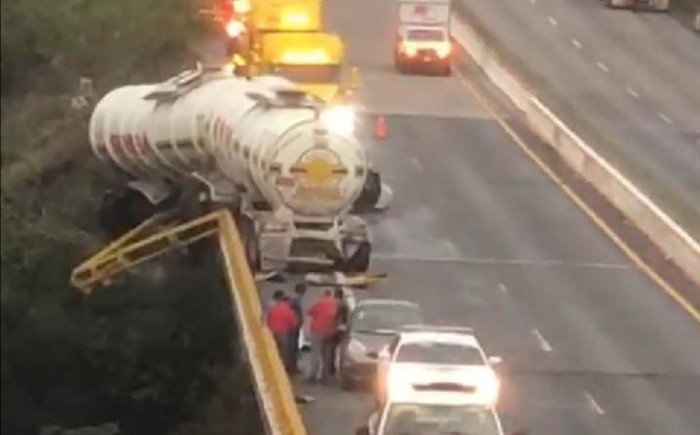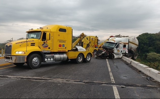 Cuitláhuac, Ver.- (AVC) Un tráiler doble pipa se accidentó contra la base y barandal de un puente de la Autopista 150D Córdoba-Veracruz y estuvo a punto de caer al voladero a la altura del municipio de Cuitláhuac; fue asegurado, jalado y puesto sobre la carpeta de rodamiento por personal de grúas, mientras oficiales de la Guardia Nacional y paramédicos de Capufe abanderaron dicho tramo carretero. El aparatoso accidente se suscitó en punto de las 07:35 horas de este miércoles en el kilómetro 19 del tramo carretero Cuitláhuac-La Tinaja, cuando el conductor del tráiler full de color blanco, de la empresa "SIMSA", Compañía de transporte de carga en Santiago Teyahualco, que remolcaba dos pipas con presunto material peligroso, perdió el control, chocó contra la base y barandal del puente y parte de él quedó suspendido en el aire. Tras la emergencia, al lugar arribaron grúas de gran tamaño tipo tráileres, así como personal de la Guardia Nacional división carreteras y paramédicos de Capufe, quienes aseguraron y realizaron el rescate de la pesada unidad para así impedir que cayera al voladero. La circulación vehicular con dirección al puerto de Veracruz se vio interrumpida por espacio de una hora y media, tiempo que duraron las maniobras de rescate, y finalmente fue enviado al corralón para el deslinde de responsabilidades.