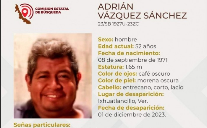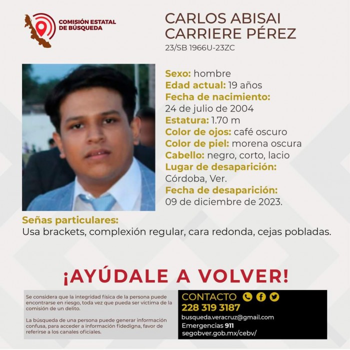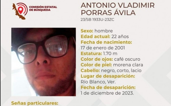 Orizaba, Ver.- (AVC) Luego de qué perdieron completa comunicación con sus familias desde el viernes 1 al sábado 9 de diciembre del presente año, la Comisión Estatal de Búsqueda de Veracruz reportó como desaparecidos a cinco hombres originarios de Ixhuatlancillo, Río Blanco y Córdoba. Adrián Vázquez Sánchez de 52 años y con domicilio en Ixhuatlancillo, desapareció el pasado viernes primero de diciembre del presente y tiene una cicatriz del lado izquierdo del rostro y un diente de platino como señas particulares, además cuenta con una estatura de 1.65 metros, ojos café oscuro, de tez morena oscura y con cabello entrecano, corto y lacio. Antonio Vladimir Porras Ávila de 22 años y con domicilio en el municipio de Río Blanco, desapareció el viernes primero de diciembre y tiene acné en el rostro en el cuello, así como cicatrices en los brazos como señas particulares, además tiene una estatura de 1.70 metros, ojos café oscuros, de tez morena clara y con cabello negro, corto y lacio. Alejandro Villanueva Gómez de 49 años y con domicilio en Córdoba, desapareció el pasado lunes 4 de diciembre, mismo que requiere de tratamiento médico especializado, tiene una verruga debajo del ojo izquierdo como seña particular, además cuenta con una estatura de 1.75 metros, ojos verdes, de tez morena clara y con cabello castaño oscuro, corto y lacio. Antoine Wilchis Sorcia de 18 años y con domicilio en el municipio de Córdoba, desapareció el sábado 09 de diciembre y tiene labios gruesos, nariz ancha y complexión delgada, además tiene una estatura de 1.82 metros, ojos café oscuros, de tez morena clara y con cabello negro, largo y ondulado. Por último Carlos Abisai Carriere Pérez de 19 años y con domicilio en Córdoba, desapareció el sábado 09 de diciembre, mismo que usa brackets, es de complexión regular, cara redonda y cejas pobladas, además tiene una estatura de 1.70 metros, ojos café oscuros, de tez morena oscura y con cabello negro, corto y lacio. Las familias ya interpusieron una denuncia por desaparición ante la Fiscalía Especializada, además de que han solicitado el apoyo de la población en general para su pronta localización y ubicación con bien, ya que temen por su integridad física al poder ser víctimas de la comisión de un delito.