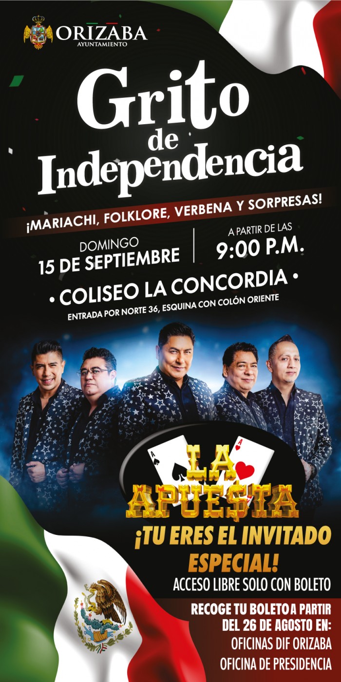 Orizaba, Ver.- (AVC) Con el fin de que la ciudadanía de Orizaba y la región de Las Altas Montañas pase un momento agradable en compañía de su familia sin tener que estar parado o mojandose, por segundo año consecutivo la ceremonia del tradicional Grito de Independencia se llevará a cabo éste próximo 15 de septiembre en el Coliseo La Concordia.