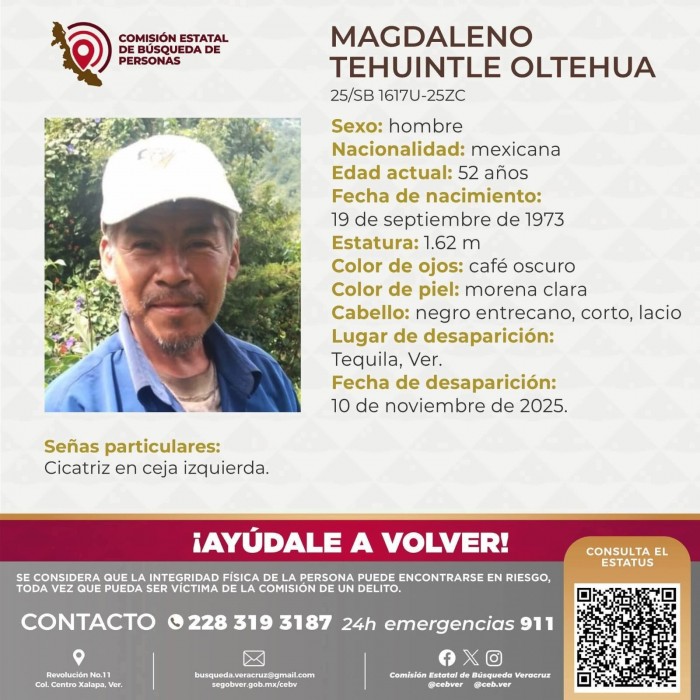 Tequila, Ver.- (AVC) Luego de permanecer desaparecido durante un mes y cuatro días, este día fue localizado sin vida Magdaleno Tehuintle Oltehua, de 52 años de edad, vecino del municipio de Tequila, Veracruz, cuyo paradero era desconocido desde el 10 de noviembre. De acuerdo con información oficial, Magdaleno fue visto por última vez en el barrio de San Antonio, tras lo cual se perdió toda comunicación con él. Ante la falta de contacto, sus familiares interpusieron el reporte ante la Comisión Estatal de Búsqueda de Personas, que emitió la ficha de localización correspondiente. Durante cuatro semanas, elementos de la Policía Municipal, familiares y voluntarios realizaron labores de búsqueda en veredas, zonas boscosas, puntos de difícil acceso, sin lograr resultados positivos. Aunque se indicó que en ocasiones el hombre solía ausentarse por varios días, el paso del tiempo incrementó la preocupación de la familia, que mantuvo activa su búsqueda. El cuerpo fue finalmente localizado en el barrio de Tlasacapixco, perteneciente al municipio de Tequila, en el fondo de un barranco y en avanzado estado de descomposición. Al lugar acudieron autoridades ministeriales y personal de la Fiscalía, quienes realizaron las diligencias legales, el levantamiento del cuerpo y el inicio de la carpeta de investigación. El cadáver fue trasladado al Servicio Médico Forense (Semefo) Regional del XV Distrito Judicial, con sede en Orizaba, donde se le practicará la necropsia de ley, a fin de determinar las causas exactas de la muerte. De manera extraoficial, se informó que el hoy occiso padecía problemas de alcoholismo, situación que en ocasiones lo llevaba a deambular por municipios cercanos. No obstante, serán las autoridades competentes quienes determinen si el fallecimiento fue accidental o derivó de alguna otra causa.