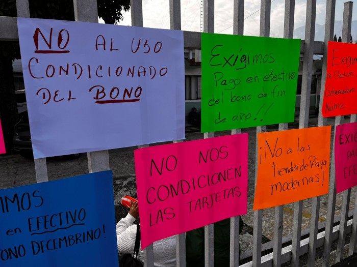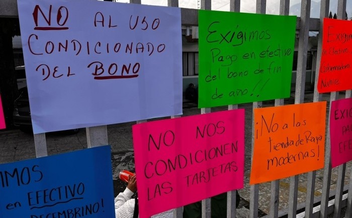 En Xalapa los trabajadores bloquearon la calle Enríquez y explicaron que los vales forman parte del bono complementario del aguinaldo, esquema que se aplica desde 2016. Detallaron que el aguinaldo equivale a 90 días, pero solo el 40 por ciento se paga en efectivo, mientras que el resto se cubre mediante bonos, que antes podían canjearse en efectivo.