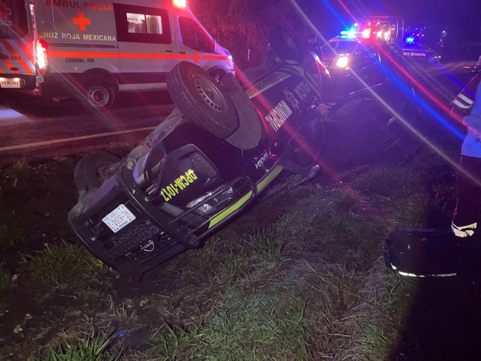 Córdoba, Ver.- Una patrulla de la Policía Municipal de Córdoba volcó durante la madrugada de este lunes en el Distribuidor Vial El Diamante. Cuatro oficiales resultaron lesionados y fueron trasladados a un hospital.