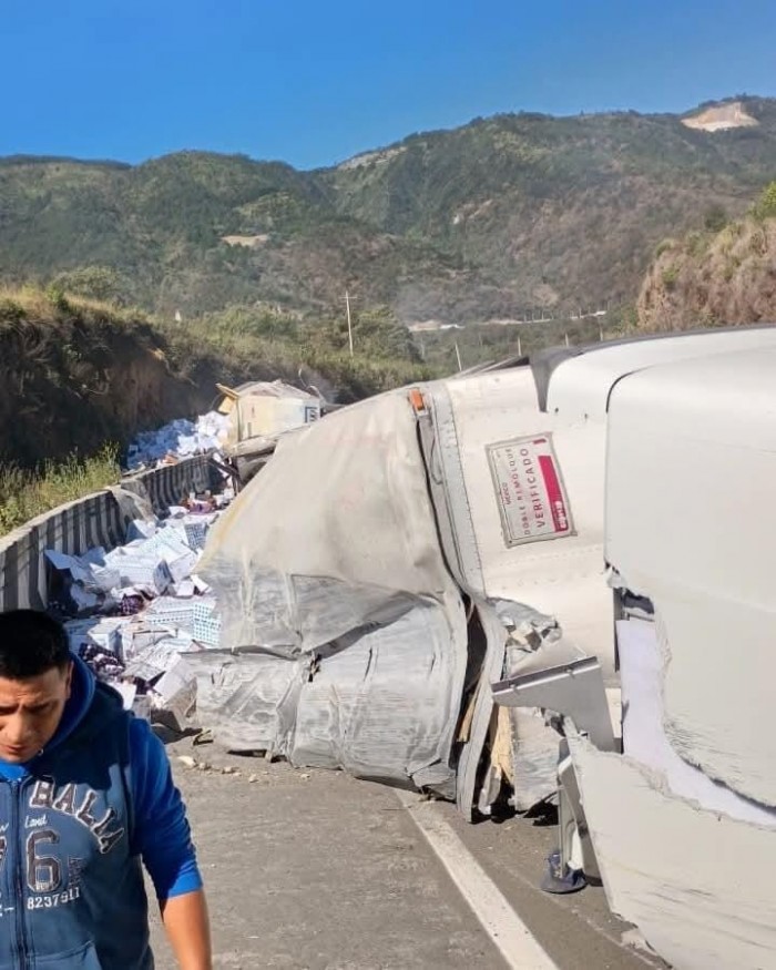 El primer siniestro ocurrió en el kilómetro 236, entre la caseta 027 de Esperanza y Ciudad Mendoza, en el municipio de Maltrata. Un tractocamión doblemente articulado perdió estabilidad en una curva y volcó sobre su costado, impactando el carril de baja, el acotamiento y muros de contención.