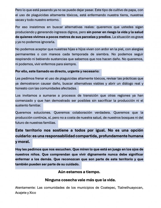 Los firmantes pidieron a productores detener el uso de plaguicidas altamente tóxicos, revisar prácticas agrícolas que —afirman— ya han demostrado causar daño y abrir un diálogo con las comunidades afectadas.