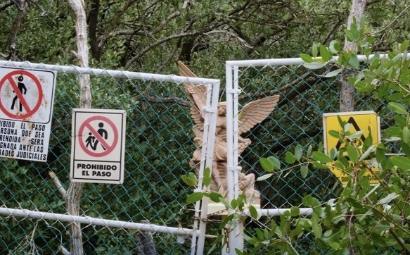 No es el único acceso en la zona. Existe otro camino de dimensiones similares que también atraviesa el manglar. En ese punto el ingreso está restringido con cercas, candados y letreros que advierten posibles sanciones judiciales.