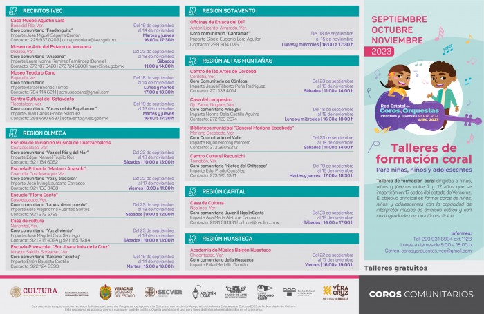 El Instituto Veracruzano de la Cultura, en colaboración con la Secretaría de Cultura federal a través del programa de Apoyo a Instituciones Estatales de Cultura (AIEC), inicia la segunda etapa de actividades de los talleres de formación coral de la Red Estatal de Coros y Orquestas Infantiles y Juveniles de Veracruz, propuestas dirigidas a infancias y juventudes de entre 7 y 17 años que se llevan a cabo de manera gratuita en ahora 17 localidades del estado. Se trata de espacios de convivencia y de intercambio cultural donde el canto coral es el eje rector que facilita el desarrollo de las niñas, niños y jóvenes, fomentando las relaciones respetuosas y positivas. Tienen como objetivo formar coros infantiles y juveniles con la capacidad de interpretar música de diversos estilos y con cierto grado de preparación escénica por medio de clases de técnica vocal, entrenamiento auditivo y lectoescritura musical. En este segundo ciclo de actividades se extienden los talleres de formación al municipio de Chicontepec, donde las niñas, niños y adolescentes tendrán oportunidad de inscribirse y acudir a la Academia de Música “El balcón de la Huasteca”, sede de este nuevo coro, para iniciar el aprendizaje del canto a voces bajo la dirección de Erika Medellín. Los demás espacios sede de la Red Estatal de Coros y Orquestas Infantiles y Juveniles se encuentran en las localidades de Antón Lizardo, Boca del Río, Coacotla, Coatzacoalcos, Córdoba, Cosoleacaque, Mariano Escobedo, Mirador Saltillo, Naolinco, Nanchital, Ojo Zarco de Nogales, Tlacotalpan, Orizaba, Papantla, Tomatlán y Xalapa. Cuatro de estos espacios pertenecen a la red de recintos del IVEC: el Museo de Arte del Estado de Veracruz, en Orizaba; el Museo Teodoro Cano, en Papantla; la Casa Museo Agustín Lara, en Boca del Río, y el Centro Cultural del Sotavento, en la ciudad de Tlacotalpan. En el Museo Teodoro Cano el estudio del violín refuerza la práctica coral, por lo que las y los participantes podrán desarrollarse en los dos ámbitos. Algunos de los talleres cuentan con una sólida trayectoria y son espacios ya conocidos de convivencia y calidad musical en sus comunidades. Es el caso de los coros de la región Olmeca, tales como el coro Voz del Río y del Mar de Coatzacoalcos, dirigido a adolescentes, y el coro Voz de mi pueblo de Cosoleacaque, los cuales han participado en los encuentros estatales desde el año 2018 y aunque han renovado a sus integrantes se han consolidado a través del tiempo. Asimismo, los coros comunitarios de la región de las Altas Montañas han destacado por la calidad de sus voces; llevados de la mano por sus directores, han participado en ferias del libro y eventos culturales realizados en los recintos del Instituto Veracruzano de la Cultura. La segunda etapa de actividades de todos los talleres gratuitos de formación coral de la Red Estatal de Coros y Orquestas Infantiles y Juveniles de Veracruz inician el lunes 18 de septiembre y concluyen el sábado 18 de noviembre del año en curso. Para participar, las personas interesadas pueden acudir directamente a las sedes donde se efectuarán los talleres y realizar el registro correspondiente. Además, los días 14 y 15 de octubre se realizará en Veracruz y Tlacotalpan el Encuentro Regional de Coros Comunitarios, región Sotavento 2023, en el que participarán los coros comunitarios Fandanguito, Cantamar y Voces del río Papaloapan, además de la agrupación coral Voces del Mar, que pertenece al Sistema Nacional de Fomento Musical. Aproximadamente 80 coreutas entonarán las piezas de un repertorio especialmente seleccionado para el canto común en esta fiesta coral. La cartelera con todas las sedes y datos de contacto de cada coro pueden consultarse en www.ivec.gob.mx. Para solicitar más información, escribir un mensaje a la dirección de correo electrónico [email protected]. Sigue todas las actividades del IVEC en las redes sociales Facebook, Instagram y YouTube: @IVECoficial y el Twitter @IVEC_Oficial.