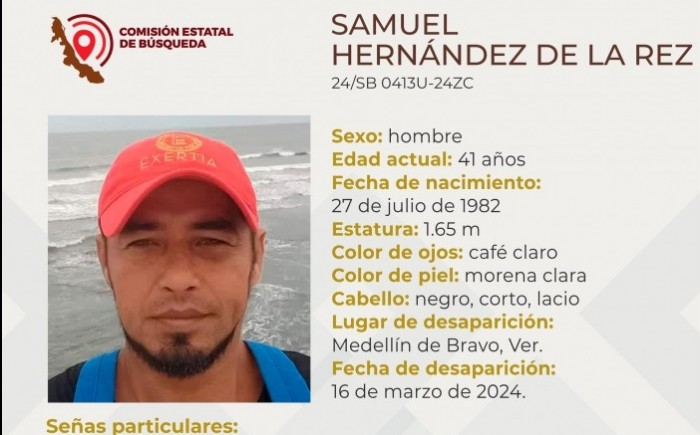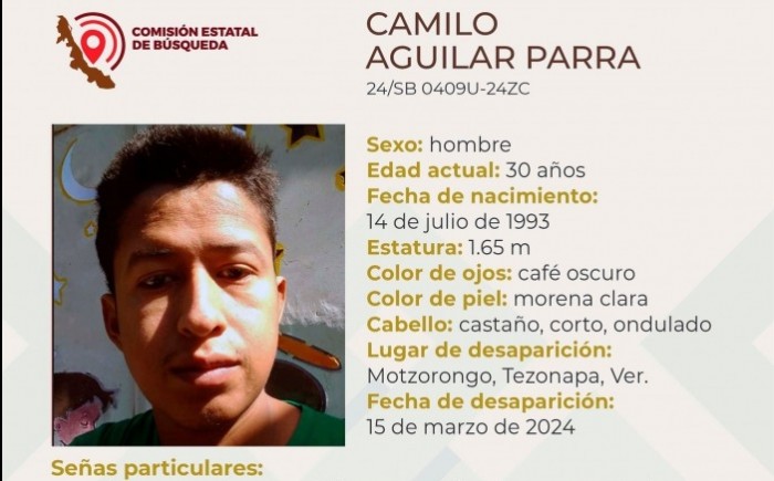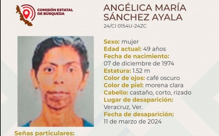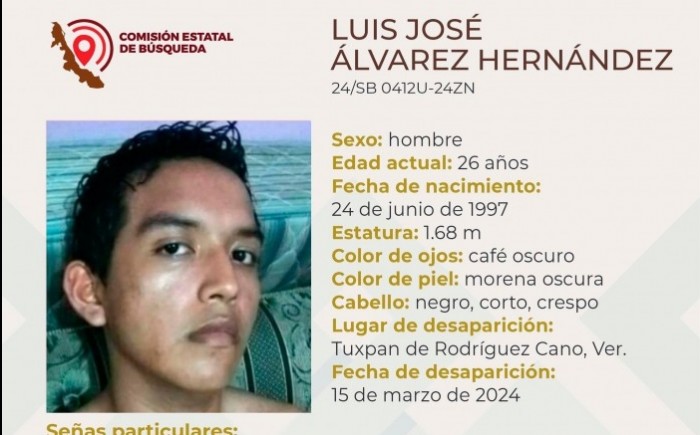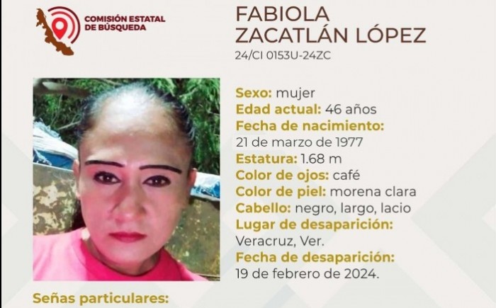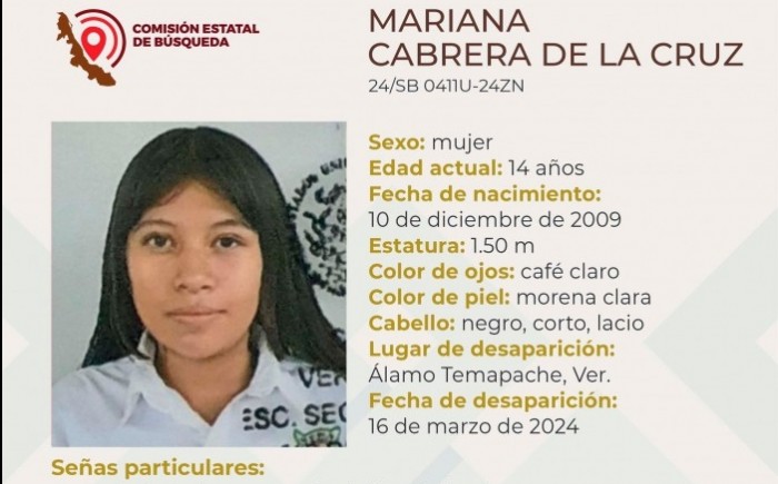 Xalapa, Ver.- (AVC) La Comisión Estatal de Búsqueda del Estado de Veracruz (CEB) reporta la desaparición de seis personas en distintos municipios de la entidad veracruzana y solicita el apoyo de la población para su pronta localización. La ficha 24/SB 0411U-24ZN reporta la desaparición de Mariana Cabrera de la Cruz, de 14 años de edad, con quien se perdió el contacto el pasado 16 de marzo de 2024 en Álamo, Temapache, Veracruz. La ficha 24/SB 0412U-24ZN reporta la desaparición de Luis José Álvarez Hernández, de 26 años de edad, con quien se perdió el contacto el pasado 15 de marzo de 2024 en Tuxpan, Veracruz. La ficha 24/SB 0409U-24ZC reporta la desaparición de Camilo Aguilar Parra, de 30 años de edad, con quien se perdió el contacto el pasado 15 de marzo de 2024 en Motzorongo, Tezonapa, Veracruz. La ficha 24/SB 0413U-24ZC reporta la desaparición de Samuel Hernández de la Rez, de 41 años de edad, con quien se perdió el contacto el pasado 16 de marzo de 2024 en Medellín de Bravo, veracruz. La ficha 24/CI 0153U-24ZC reporta la desaparición de Fabiola Zacatlán López, de 46 años de edad, con quien se perdió el contacto el pasado 19 de febrero de 2024 en Veracruz, Veracruz. La ficha 24/CI 0154U-24ZC reporta la desaparición de Angélica María Sánchez Ayala, de 49 años de edad, con quien se perdió el contacto el pasado 11 de marzo de 2024 en Veracruz, Veracruz.