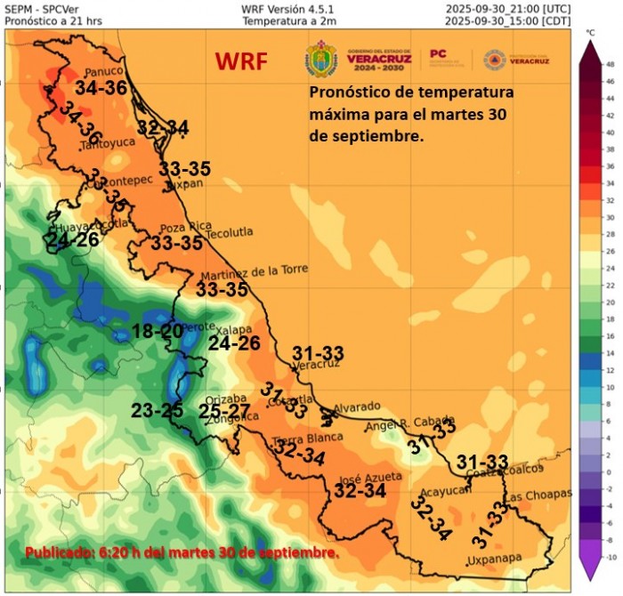 Xalapa, Ver.- (AVC) El centro de baja presión localizado esta mañana sobre la parte central del Golfo de México y que, de acuerdo con el pronóstico tenderá a moverse hacia el oeste y suroeste del mismo Golfo en los siguientes días como una vaguada. Además, se apoyará con la divergencia del viento en altura para aumentar el potencial de lluvias y tormentas a lo largo de la entidad con los máximos acumulados en montañas del centro y mayormente en cuencas del sur. Asimismo, el sistema mantendrá el viento del Norte en costas con ligera intensificación entre miércoles a viernes, mismo que elevará el oleaje cerca del litoral. Pronóstico: Martes 30: probabilidad de lluvias y tormentas aisladas, principalmente en la región montañosa central y cuencas del sur. Acumulados de 5 a 20 mm en promedio con máximos de 20 a 50 mm. Viento del Noroeste y Norte de 20 a 35 km/h con rachas de 45 a 60 km/h en las costas. Ambiente relativamente caluroso a caluroso al mediodía y primeras horas de la tarde. Oleaje de 1.0 a 2.0 metros en las proximidades de la costa. Miércoles 01: potencial de lluvia y tormentas aisladas. Acumulados de 5 a 20 mm en promedio en la entidad con máximos de 30 a 50 mm, estas últimas principalmente entre las cuencas del Papaloapan al Tonalá, siendo probables mayores de forma dispersa. Viento del Noroeste y Norte de 30 a 40 km/h con rachas de 55 a 70 km/h en la costa central y de 45 a 55 km/h en las costas norte y sur. Ambiente relativamente caluroso a caluroso al mediodía y primeras horas de la tarde. Oleaje de 1.0 a 2.0 metros en las proximidades de la costa. Jueves 02: potencial de lluvias y tormentas aisladas. Acumulados de 5 a 20 mm en promedio en el estado con máximos de 70 a 150 mm entre las cuencas del Papaloapan al Tonalá y de 20 a 50 mm en el resto de las cuencas, sin descartar mayores. Viento del Noroeste y Norte de 30 a 40 km/h con rachas de 60 a 70 km/h en la costa central y de 50 a 65 km/h en las costas norte y sur. Ambiente relativamente caluroso a caluroso al mediodía y primeras horas de la tarde. Oleaje 1.0 a 2.0 metros en las proximidades de la costa, los más altos en la costa sur. Viernes 03: Potencial de lluvias y tormentas aisladas. Acumulados de 5 a 20 mm en promedio en el estado con máximos de 70 a 150 mm entre las cuencas del Papaloapan al Tonalá y de 30 a 50 mm entre las cuencas del Nautla al Jamapa Cotaxtla, sin descartar mayores. Viento del Noroeste y Norte de 30 a 40 km/h con rachas de 60 a 70 km/h en la costa central y de 50 a 65 km/h en las costas norte y sur. Ambiente relativamente caluroso a caluroso al mediodía y primeras horas de la tarde. Oleaje 1.0 a 2.0 metros en las proximidades de la costa, los más altos en la costa sur. IMPORTANTE: Tome en cuenta que el suelo está saturado y por lo tanto, ante el pronóstico de lluvias pueden presentarse más procesos de remoción en masa, y mayor facilidad de que, aumenten los niveles de los ríos.