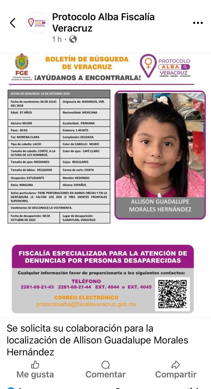 Xalapa, Ver.- (AVC/Verónica Huerta) El mecanismo para la localización de mujeres con reporte de extravío Protocolo Alba Veracruz publicó las fichas de la profesora María Guadalupe Hernández Hernández y su menor hija Allison Guadalupe Morales Hernández, en la noche del martes 14 octubre.