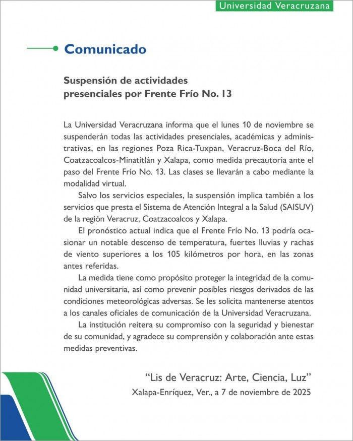 Xalapa, Ver.- (AVC) La Universidad Veracruzana informó que el lunes 10 de noviembre se suspenderán todas las actividades presenciales académicas y administrativas en las regiones Poza Rica-Tuxpan, Veracruz-Boca del Río, Coatzacoalcos-Minatitlán y Xalapa, ante el paso del Frente Frío número 13. Clases virtuales por medidas preventivas La institución señaló que las clases se desarrollarán mediante la modalidad virtual, mientras que los servicios del Sistema de Atención Integral a la Salud (SAISUV) también suspenderán actividades en las regiones Veracruz, Coatzacoalcos y Xalapa. Pronóstico de fuertes lluvias y vientos De acuerdo con el pronóstico meteorológico, el Frente Frío 13 provocará un marcado descenso de temperatura, lluvias intensas y rachas de viento superiores a los 105 kilómetros por hora en las zonas afectadas. UV pide atender canales oficiales La medida busca proteger la integridad de la comunidad universitaria y prevenir riesgos ante las condiciones climáticas adversas. La UV exhortó a estudiantes, personal y docentes a mantenerse atentos a los canales oficiales de comunicación.