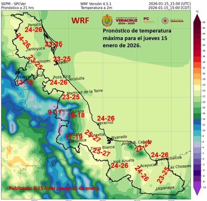 Xalapa, Ver.- (AVC) En las próximas 24 horas en Veracruz se prevén nieblas, lloviznas y lluvias ligeras a moderadas, con los acumulados más importantes en la zona sur. En la costa, el viento del Norte puede registrar rachas de 70 a 90 km/h, con tendencia a disminuir por la tarde-noche. El ambiente se mantendrá templado a fresco al mediodía y fresco a frío por la noche y madrugada, con probabilidad de heladas al amanecer en zonas altas. El potencial de lluvias y la intensidad del viento disminuyen el viernes, pero se mantendrá ambiente templado a fresco al mediodía y fresco a frío, con probabilidad de heladas en partes altas por las noches y madrugadas, probablemente hasta principios de la próxima semana. Otro frente frío junto con su masa de aire puede afectar a nuestro estado entre el sábado 17 y el lunes 19 de enero con nuevo aumento del potencial de lluvias, así como evento de Norte con posibles rachas de 60 a 80 km/h en la costa. El frente frío 28 se localiza desde el centro de Florida hasta el centro-oeste del Golfo de México, mientras que su masa fría se ha desbordado sobre el litoral del Golfo de México. Tales sistemas ocasionarán este día nublados con lluvias y posibles tormentas en montañas del centro y cuencas del sur, viento del Norte que alcanza rachas violentas en costas de Veracruz, previéndose disminuya por la tarde y noche, y nuevo descenso de temperatura. Pronóstico: Jueves 15: Probabilidad de nieblas, lloviznas, lluvias y tormentas, con acumulados de 5 a 20 mm y máximos mayores a 30 mm, principalmente en la región de los Tuxtlas y cuencas Coatzacoalcos-Tonalá. Viento del Noroeste y Norte de 50 a 60 km/h con rachas de 70 a 90 km/h en la costa centro y sur, de 55 a 65 km/h en la costa norte y de 45 a 65 km/h entre Xalapa-Naolinco-Misantla y valle de Perote, decreciendo por la tarde-noche. Ambiente templado a fresco al mediodía y primeras horas de tarde, y fresco a frío por la noche a madrugada, con probabilidad de heladas en partes altas. Oleaje de 1.0 a 3.0 metros en las proximidades de la costa.