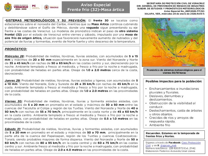 Xalapa, Ver., 28 de enero de 2026. — El frente frío número 30 y el ingreso de un nuevo sistema frontal entre viernes y sábado generarán lluvias, evento de Norte fuerte, oleaje elevado y descenso de temperatura en el estado de Veracruz, de acuerdo con el pronóstico meteorológico.