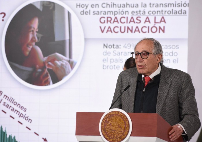 Ciudad de México.- (AVC) El secretario de Salud, David Kershenobich Stalnikowitz, informó que en México se han registrado 9 mil 074 casos de sarampión desde 2025. Señaló que la tasa acumulada es de 6.7 casos por cada 100 mil habitantes y destacó la vacunación como medida de control. Durante la conferencia presidencial de este miércoles, el funcionario indicó que, frente a una población de 133 millones de habitantes, el número de contagios registrados se mantiene en 9 mil 074 desde 2025. “Si no tuviéramos la protección de la vacunación y siendo un virus altamente contagioso tendríamos millones de mexicanos infectados por sarampión”, afirmó. Precisó que por cada 100 mil habitantes se registra una tasa acumulada de 6.7 casos y sostuvo que “la vacunación es la manera de controlar el brote al bajar la tasa de transmisión”. El titular de Salud reconoció que el sarampión es una de las enfermedades virales con mayor índice de transmisión. Explicó que una persona enferma puede contagiar hasta a 18 personas a su alrededor. Además, señaló que el virus puede permanecer en el espacio donde estuvo una persona infectada hasta por dos horas después de retirarse. Detalló que en su fase inicial la enfermedad presenta síntomas como fiebre, malestar general y escurrimiento nasal. Recomendó acudir al médico ante estos signos y evitar la automedicación. Indicó que el tratamiento consiste en control de síntomas con paracetamol u otros medicamentos indicados por personal de salud, sin el uso de antibióticos salvo en caso de complicaciones. Añadió que el salpullido aparece aproximadamente cuatro días después del inicio del cuadro y desaparece posteriormente. El secretario reiteró que la vacunación es la principal herramienta para reducir la transmisión y controlar el brote, por lo que llamó a mantener los esquemas completos conforme a las disposiciones del sector salud. Por último destacó que el 49 por ciento de los casos presentados hasta el momento ocurrieron en el estado de Chihuahua y otros siete estados presentan la mayor parte de casos: Jalisco, Colima, Chiapas, Sinaloa, Nayarit, Tabasco y Ciudad de México.