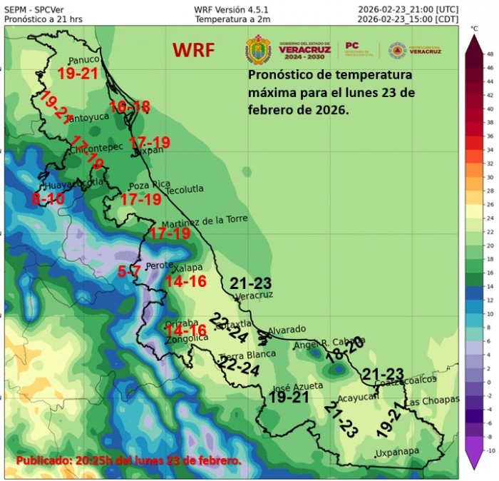 Xalapa, Ver.- (AVC) En las próximas 24 a 48 horas se espera en la entidad veracruzana ambiente templado a fresco durante el día; fresco a muy frío por las noches y madrugadas con heladas en partes altas. Disminuye la probabilidad lluvias y tormentas, este día con los máximos acumulados en cuencas del Papaloapan al Tonalá, incluido Los Tuxtlas y costas del norte y centro. El viento del Norte, pierde intensidad, alcanzando todavía rachas de 55 a 70 km/h en las costas centro y sur, cambiando al noreste, este y sureste mañana. Olas de 2.0 a 4.0 metros hoy, decreciendo. En los siguientes días la temperatura máxima aumenta gradualmente, pero se mantiene el ambiente fresco a frío por las noches y madrugadas, la probabilidad de lluvias será baja y el viento dominará del Este y Sureste.