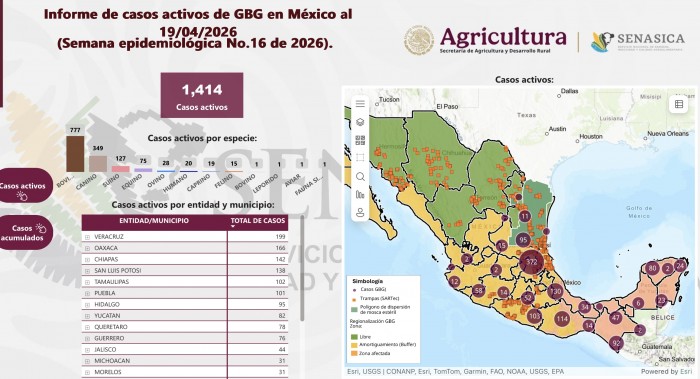 Los datos corresponden a la semana epidemiológica 16 de 2026, difundidos por la Secretaría de Agricultura y el Servicio Nacional de Sanidad, Inocuidad y Calidad Agroalimentaria (SENASICA), que mantienen vigilancia en diversas regiones del país.