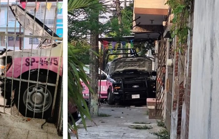 Xalapa, Ver.– (AVC) Una familia quedó atrapada dentro de su vivienda luego de que una patrulla con logotipos de la Policía Estatal se impactó contra la fachada tras un choque con una camioneta particular.
