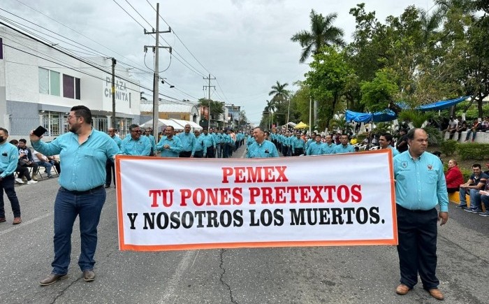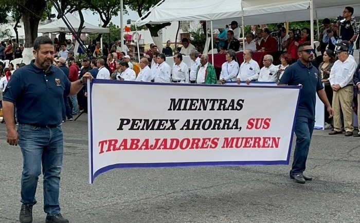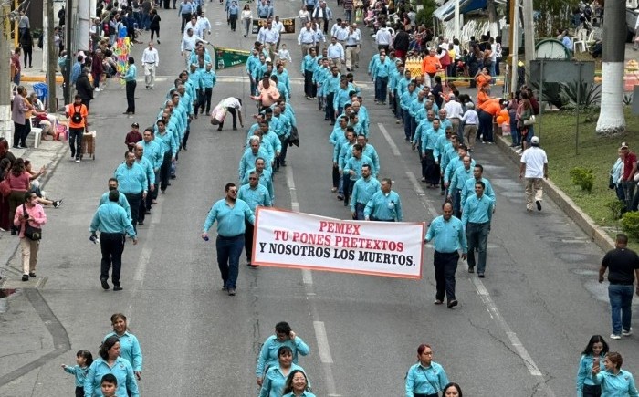 Poza Rica. Ver.- (AVC/Misael Olmedo) En medio de reclamos a la administración de Petróleos Mexicanos (Pemex) y en luto por trabajadores petroleros fallecidos en explosión en el sur de Veracruz se realizó el desfile conmemorativo al 85 aniversario de la Expropiación Petrolera con la participación de más de 10 mil personas. Durante este recorrido cívico los trabajadores petroleros activos y jubilados realizaron distintos reclamos a directivos de Pemex por las carencias que enfrentan en sus áreas de trabajo. Exigieron que Pemex respete el contrato colectivo de trabajo y destacaron que preocupa que incumpla con el pago de jubilaciones a viudas y familiares de trabajadores petroleros. “Pemex tú pones pretextos y nosotros los muertos” destacaron trabajadores petroleros integrantes de los distintos departamentos que conforman la sección 30 del Sindicato de Trabajadores Petroleros de la República Mexicana (STPRM). Durante el recorrido portaron un moño negro en el brazo derecho como muestra de luto y en memoria de sus compañeros trabajadores que fallecieron por la explosión que se registró en la refinería de Minatitlán. Además de trabajadores petroleros en este recorrido se sumaron estudiantes de más de 70 instituciones educativas, desde nivel primaria hasta universidades y también algunos grupos independientes. El recorrido fue encabezado por el presidente municipal, Fernando Luis Remes Garza; el secretario general de la sección 30 del STPRM, José Juan Soni Solís y el presidente del Frente de Resistencia y Unidad Sindical (FRUS), Sergio Lorenzo Quiroz Cruz.