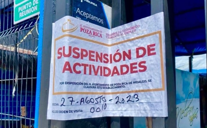 Poza Rica, Ver.- (AVC/Misael Olmedo) Al menos tres centros nocturnos de la avenida 20 de noviembre fueron clausurados temporalmente por autoridades municipales en apego al acuerdo con el gobierno estatal por no respetar horarios para su funcionamiento. Durante la madrugada de este domingo personal de la dirección de desarrollo económico en un operativo con el respaldo de la policía estatal y elementos militares arribaron a diversos establecimientos que operaban como antros en dicha avenida. Fue pasadas de las 2:00 horas de la madrugada cuando arribaron las unidades y los elementos de seguridad ordenaron el desalojo de clientes y el cierre de las instalaciones. Mientras que personal del gobierno local notificó el cierre temporal y colocaron los sellos en los accesos y fachada de cada uno de los establecimientos. Cabe recordar que como parte de las acciones de prevención del delito y por acuerdo entre autoridades estatales y municipales en Poza Rica desde el mes de mayo se exhortó a unidades económicas que venden alcohol como antros y bares a respetar horarios establecidos, de lo contrario hay multas de hasta 50 mil pesos o clausura de los inmuebles. De acuerdo con la circular que en su momento fue enviada a empresarios y propietarios de estos establecimientos la venta de alcohol y funcionamiento es de 8:00 a 22:00 horas para agencias y depósitos de cerveza, cantinas y bares, restaurantes con venta preponderante de licor, vinaterías, expendios de vinos y licores o bebidas preparadas, cervecerías, pulquerías, fondas, coctelerías y loncherías con venta de cerveza y otorgándose una hora de tolerancia para su cierre total (sin clientes dentro del establecimiento). Mientras que de 18:00 a 01:00 horas cabarets, centros nocturnos y discotecas. Otorgándose una hora de tolerancia para su cierre total (sin clientes dentro del establecimiento) De 10:00 a 20:00 horas en salones de juegos permitidos, ajedrez y domino, electrónicos y similares. Otorgándose una hora de tolerancia para su cierre total. Cabe señalar que esta clausura se da días después de que se anunció la próxima edición del programa “Vive tu noche” que se realizará en dicha avenida el 16 de septiembre.