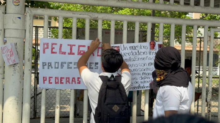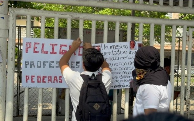Poza Rica, Ver.- (AVC/Misael Olmedo) Estudiantes y algunos padres de familia de la Escuela Secundaria y Bachilleres Oficial (ESBO) número 8 “Emiliano Zapata”, en Poza Rica, protestaron para exigir la destitución de un profesor señalado de acoso sexual. Con pancartas exhibieron al docente identificado como Guillermo por presuntos actos de acoso en reiteradas ocasiones. Reclamaron a las autoridades educativas por intentar minimizar los señalamientos que se han realizado en contra del profesor de matemáticas e informática. La protesta comenzó en el interior del plantel ubicado en la colonia Las Palmas y continuó en las afueras donde se expresaron las consignas por esta situación. A través de un comunicado este plantel confirmó que el docente de secundaria identificado como Guillermo fue separado del cargo y no tiene permitido ingresar a las instalación. Esta situación deriva de señalamientos que algunos padres de familia realizaron la semana pasada sobre los presuntos actos de acoso en agravio de alumnas. La institución comunicó que se iniciará el procedimiento administrativo para determinar la sanción correspondiente ante estos señalamientos.