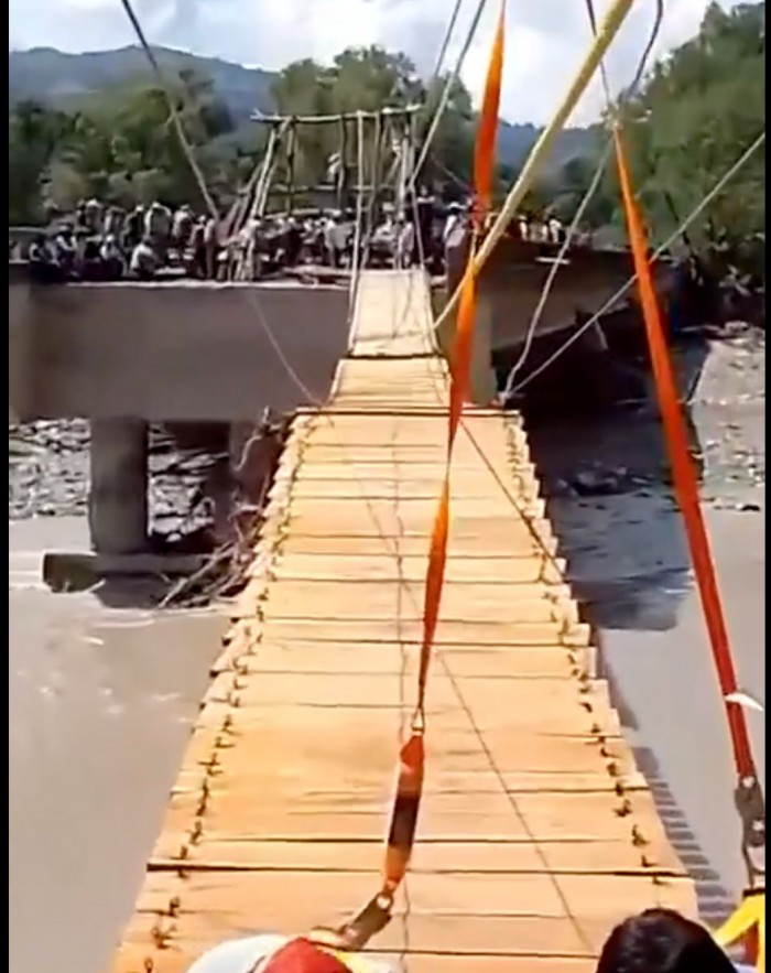 En la localidad de Tzicatlán, los pobladores permanecen incomunicados y, sin recibir apoyo oficial, construyeron su propio puente con troncos y cuerdas para salir y conseguir víveres.