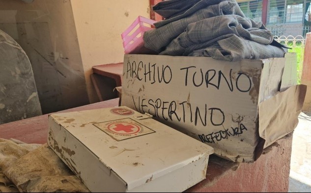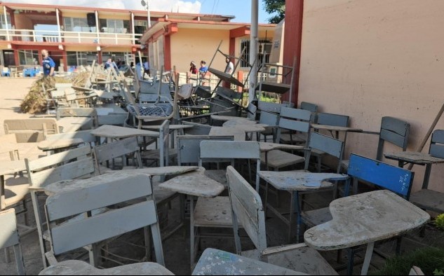 2025-11-05.- Padres de familia y personal de la secundaria general “Alfonso Arroyo Flores” señalan que no ha concluido la limpieza, no hay recursos para su total rehabilitación y el edificio presenta daños en su estructura.