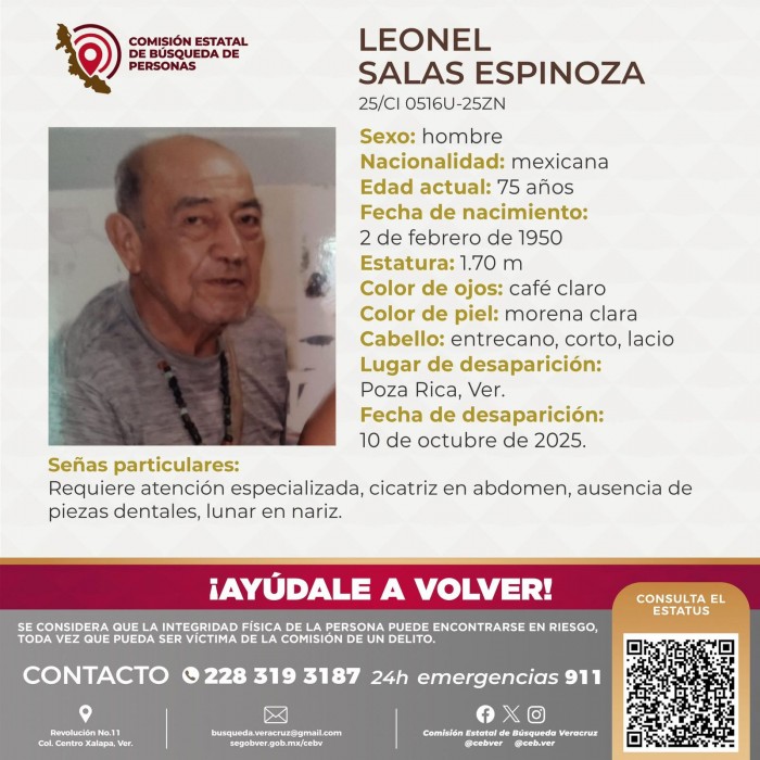 Poza Rica, Ver.- (AVC) En Poza Rica sigue sin ser localizado Leonel Salas Espinoza, un hombre de 75 años de edad del que no se sabe nada desde el 10 de octubre cuando la inundación por el desbordamiento del río Cazones alcanzó la colonia Las Granjas en donde fue visto por última vez. Familiares continúan con las solicitudes a la población que pueda tener algún dato para dar con su paradero pues son ya más de dos meses buscándolo. La comisión estatal de búsqueda de personas en Veracruz mantiene activa una ficha con sus características físicas y en la que se indica requiere atención especializada y como señas particulares tiene una cicatriz en abdomen, ausencia de piezas dentales y lunar en nariz. Autoridades federales señalaron que aún hay 7 personas sin localizar en el norte de Veracruz durante este temporal de lluvias y la inundación del 10 de octubre.