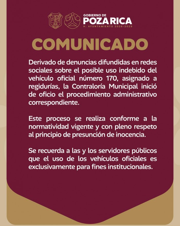 Poza Rica, Ver.- (AVC) El Gobierno de Poza Rica informó que la Contraloría Municipal inició un procedimiento administrativo por el posible uso indebido de un vehículo oficial, tras denuncias difundidas en redes sociales.