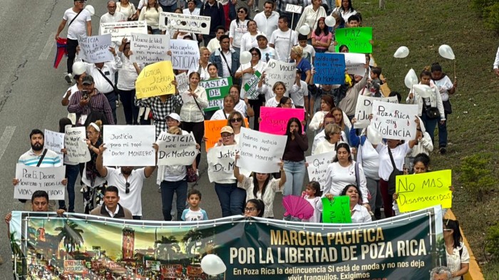 Poza Rica, Ver.– (AVC/Misael Olmedo) Ciudadanos y personal médico marcharon este día en Poza Rica para exigir justicia por el asesinato del doctor José Antolín Montero Alpírez, quien fue privado de la libertad y posteriormente localizado sin vida.
