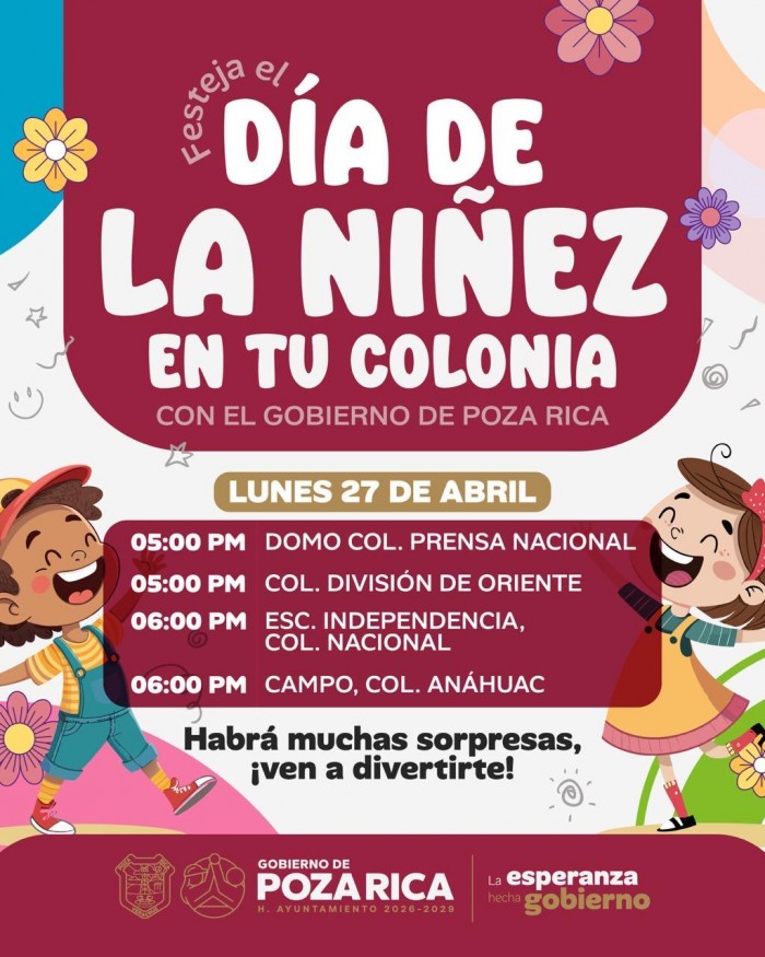 Poza Rica, Ver.— (AVC) El Gobierno municipal anunció el inicio de una caravana por el Día del Niño, la cual recorrerá diversas colonias con actividades dirigidas a la niñez y culminará el 30 de abril en la Plaza Cívica.