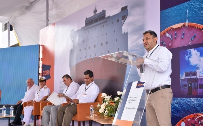 Durante su discurso, Amado Cruz explicó que el ferrobuque Mayan es el segundo barco que se mandó a construir a China, particularmente a Cantón, en el sureste de ese país, cuyo origen presagia un buen augurio de su futuro relacionado con esta ciudad.