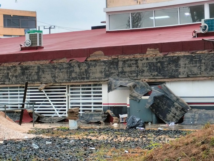 Un tramo del techo del nuevo Centro de Salud de Las Choapas se desplomó durante la primera lluvia fuerte de la temporada, dejando expuestas filtraciones, humedad y materiales deteriorados en el área principal del edificio.