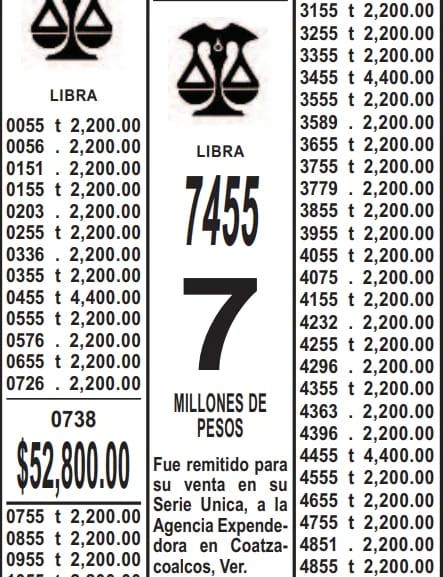 El premio correspondió al signo Libra, número 7455, resultado del sorteo realizado la noche del domingo. El billete fue remitido en serie única a una agencia expendedora de Coatzacoalcos, donde finalmente se colocó entre el público.