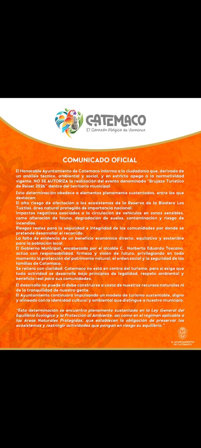 Catemaco, Ver.— (AVC) El Ayuntamiento de Catemaco informó que no autorizó la realización del evento “Brujazo Turístico de Reiser 2026” dentro del territorio municipal, tras un análisis técnico, ambiental y social.