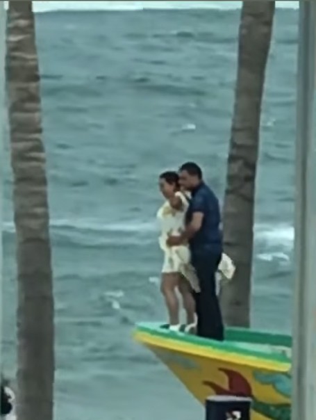Las imágenes que circulan muestran a un hombre sosteniendo por la cintura mientras ella extiende los brazos en la proa de una lancha 'decorativa' que tiene sobre su superficie una pintura con imágenes representativa del puerto de Veracruz.