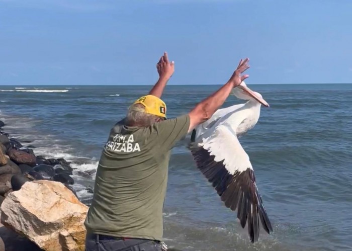 Orizaba, Ver.- (AVC) Este día fue liberado en las costas del puerto de Veracruz por parte de la Unidad de Manejo Ambiental Citláltepetl de la Ciudad de Orizaba, un pelícano que aparentemente sufrió una desorientación y cayó en el patio de una vivienda de la Pluviosilla, reintegrándolo así a su hábitat natural. Se presume que el ave acuática de aproximadamente 80 centímetros de altura y color blanco con plumaje negro en las alas, viajaba con una parvada y cuando cruzaba la Ciudad de Orizaba presentó una desorientación y cayó al patio de una vivienda particular durante la mañana de ayer martes. La espectacular ave que se caracteriza por su largo pico con un gran saco gular que utiliza para la captura de sus presas, fue asegurado por el dueño del domicilio y entregado a la Unidad de Manejo Ambiental (UMA) Citlaltépetl, en donde recibió alimentación y fue valorado por los médicos veterinarios. Luego de que los especialistas confirmaron que el estado de salud del pelícano era bueno, se determinó trasladarlo a las costas del Puerto de Veracruz para ser liberado. La coordinadora de la UMA, Mayra de la Vega Aduna, señaló que con estas acciones se cumple con la preservación y la protección de la fauna silvestre.