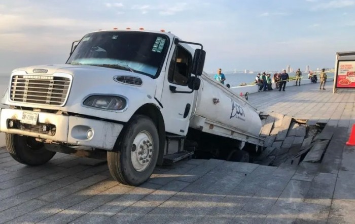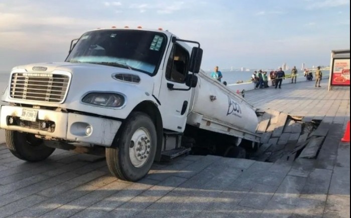 Veracruz, Ver.- (AVC) Una pipa del Ayuntamiento de Boca del Río se hundió esta mañana de jueves en la banqueta del bulevar Manuel Ávila Camacho, a la altura de Playa Pelícano.