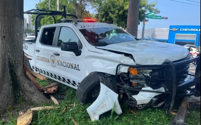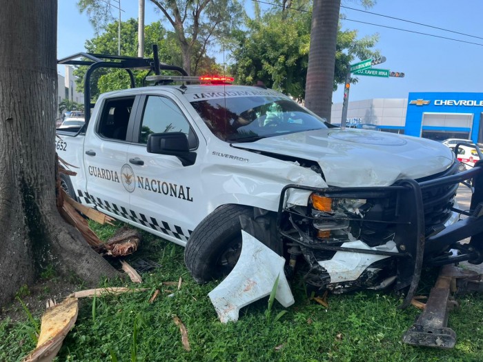 Veracruz, Ver.- (AVC/Sergio Aldazaba) Una patrulla de la Guardia Nacional que circulaba por céntricas calles de Veracruz protagonizó un fuerte accidente luego de pasarse la luz roja de un semáforo, estrellarse contra un auto particular y finalmente con un árbol. La información recabada en el lugar indica que los oficiales circulaban por la avenida Salvador Díaz Mirón en el carril que va con dirección de norte a sur, pero aparentemente no iban a ningún auxilio en ese momento. Al llegar al cruce de Francisco Javier Mina presuntamente no respetaaron la luz roja del semáforo e impactaron en ángulo a una familia que tripulaba un auto particular de la marca Chevrolet tipo Optra color plata. En este último viajaba el señor Ciro de 68 años de edad, el cual iba a dejar a su hija y a su yerno a su trabajo a unas cuadras de ahí, mismo que ya no pudo esquivar la patrulla, misma que salió proyectada al camellón donde le pegó a un árbol. Paramédicos de la Cruz Roja llegaron para brindarle los primeros auxilios a los involucrados, de los cuales el conductor del particular fue quien resultó más golpeado, pero se negó a ser trasladado a un hospital en ambulancia. Ya por último un perito de la delegación de Tránsito y Vialidad Municipal de Veracruz llegó para tomar conocimiento del hecho y ordenó el retiro de las dos unidades para así poder deslindar responsabilidades.