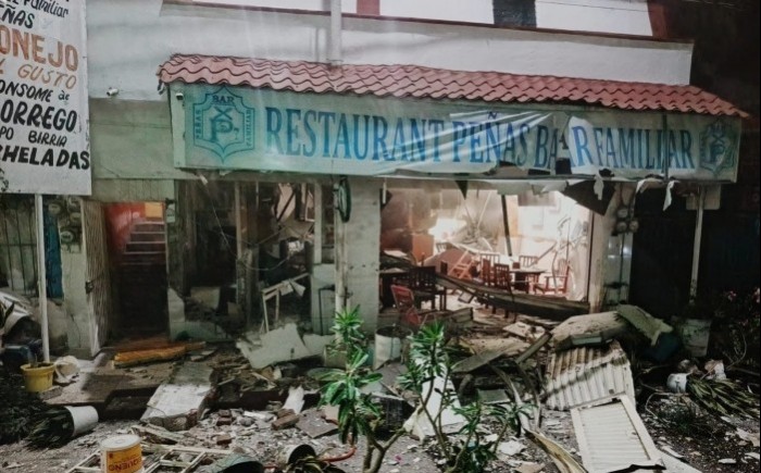 2025-12-11.- La explosión de un tanque de gas en el restaurante "Peñas Bar" de Ciudad Cardel dejó cuatro lesionados y daños en locales vecinos; autoridades investigan.