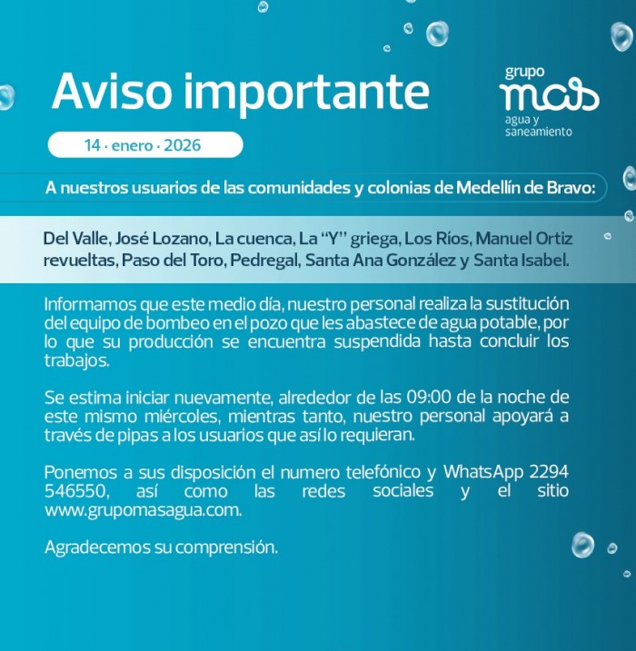 2026-01-14.- Grupo MAS suspende el suministro de agua este miércoles en colonias de Medellín de Bravo por trabajos de sustitución de equipo de bombeo.