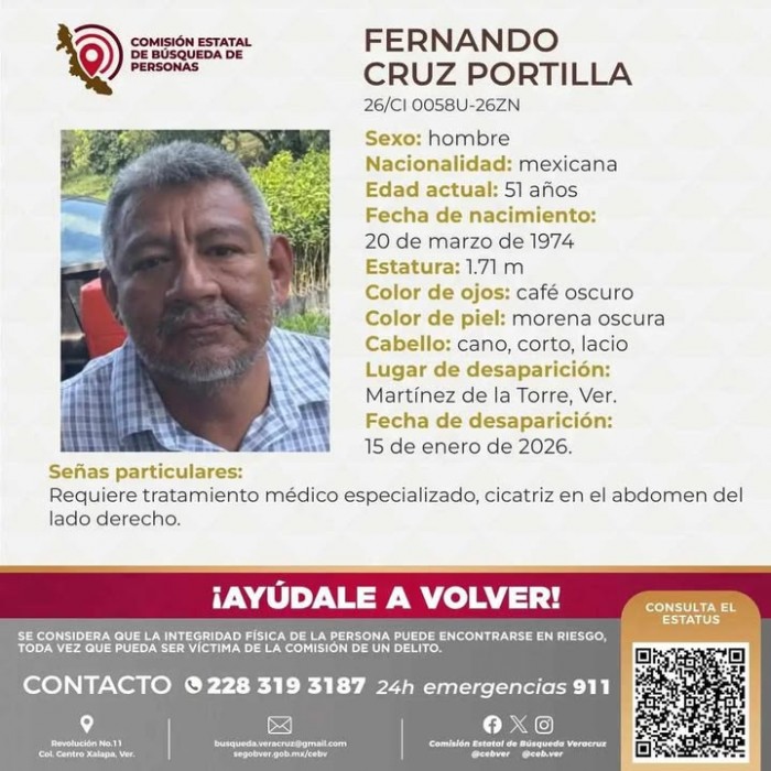 Xalapa, Ver.- (AVC) A doce días de que el señor Fernando Cruz Portilla salió de Martínez de la Torre rumbo al puerto de Veracruz a realizarse exámenes médicos, no se tiene información de su paradero.