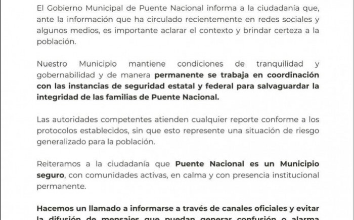 Puente Nacional, Ver.- (AVC) La alcaldesa Bibi Báez afirmó que en el municipio existen condiciones de tranquilidad y gobernabilidad, luego de una denuncia difundida en redes sociales por el diputado Héctor Yunes Landa sobre un presunto hecho delictivo en la zona. El legislador informó en su cuenta de Facebook que, al circular rumbo a Huatusco, observó un cuerpo con sangre, envuelto en una sábana y atado, a unos metros de la comunidad Mata de Zarza, en el municipio de Puente Nacional. En su publicación, Yunes Landa señaló que el hecho ocurrió el mismo día en que la comunidad celebraba su fiesta patronal, a la que asistiría el Obispo de Veracruz para oficiar una misa. Sin desmentir la versión, la alcaldesa indicó que, ante la información difundida en redes sociales y medios, “es importante aclarar el contexto y brindar certeza a la población”. Añadió que el gobierno municipal mantiene coordinación permanente con fuerzas estatales y federales. Precisó que cualquier reporte es atendido conforme a los protocolos establecidos, “sin que esto represente una situación de riesgo generalizado para la población”. La presidenta municipal reiteró que Puente Nacional cuenta con presencia institucional y comunidades en calma, y exhortó a la población a informarse por canales oficiales y evitar la difusión de mensajes que generen confusión o alarma innecesaria. Hasta el momento, no se ha emitido una postura oficial por parte de las autoridades de procuración de justicia estatales o federales sobre el hecho denunciado.