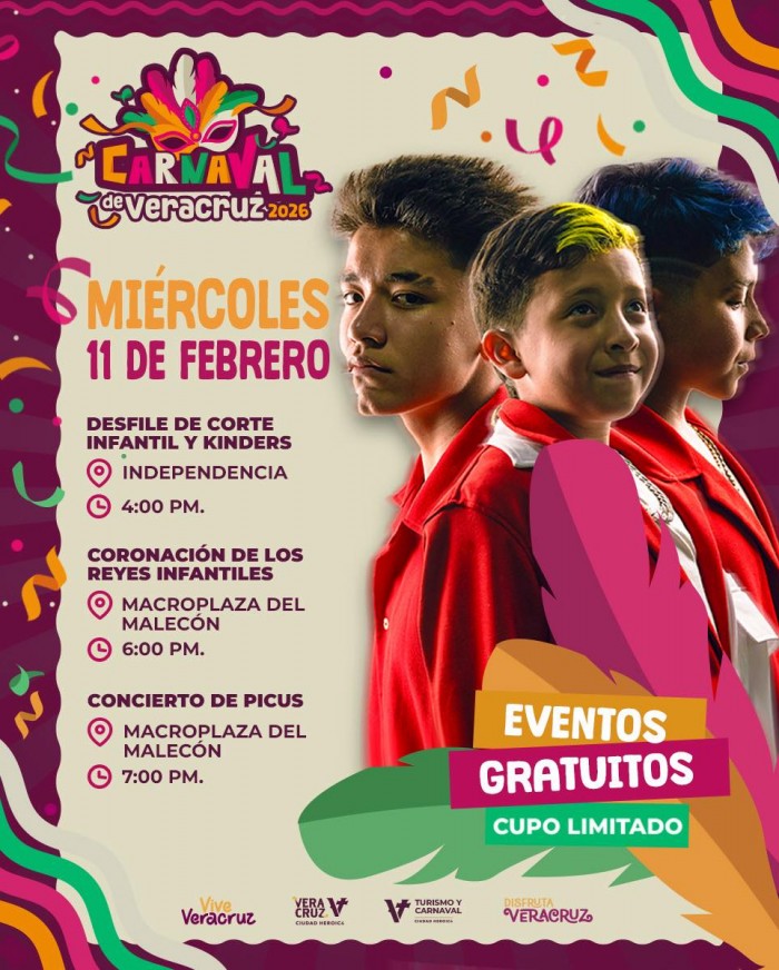 Veracruz, Ver.- (AVC) El Carnaval de Veracruz 2026 realizará el miércoles 11 de febrero actividades dirigidas al público infantil, con desfile, coronación y concierto en el bulevar y la Macroplaza del Malecón.