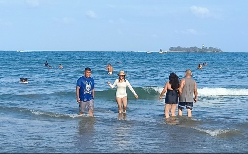 Isabel y familiares, quienes viajaron de Papantla a este destino turístico, aprovecharon las condiciones climatológicas para disfrutar de la playa de Villa del Mar.