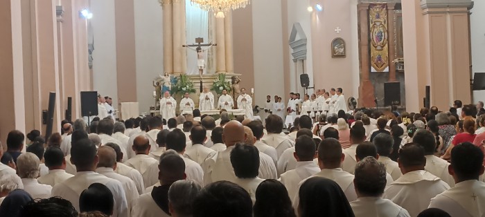 Veracruz, Ver.- (AVC/José Juan García) Ciento treinta presbíteros y cuarenta religiosos de la diócesis de Veracruz renovaron sus promesas sacerdotales en la misa crismal que celebró el obispo Carlos Briseño Arch en la catedral de Nuestra Señora de la Asunción este jueces santo. De igual forma, Briseño Arch bendijo los óleos y el santo crisma durante la misa que presidió y donde estuvo como concelebrante el obispo emérito Luis Felipe Gallardo Martín del Campo. “Esta misa, que es la misa de la mañana, es la misa crismal, la misa donde celebramos el sacerdocio de Cristo, pero sobre todo es la renovación de las promesas sacerdotales y es una misa especial donde se bendicen los óleos, son tres tipos de aceites bendecidos, uno sirve para los bautizados, para liberar de todo mal, el óleo de los catecúmenos, el óleo de los enfermos y el santo crisma”, explicó. El prelado reconoció que ha habido sacerdotes que dejaron el ministerio por diversas causas que se reservó porque se trata de casos que no edifican. Por otra parte, el obispo explicó que la misa llamada “de la cena del Señor”, que se celebró el jueves santo por la tarde, representa una invitación a ser servidores del prójimo. Carlos Briseño Arch destacó que la Iglesia Católica promueve la comunión, la unión entre los pueblos, la paz, la reconciliación, el amor y e servicio a los demás, los cuales son valores universales. “Y a buscar la comunión y la fraternidad entre todos”, remató. Cabe mencionar que las celebraciones de la Semana Santa continuarán este viernes con el vía crucis que está programado por la mañana, el cual partirá a la altura del hotel Mar y Tierra y se dirigirá a la catedral por el paseo Comodoro Manuel Azueta. Además, la misma tarde del viernes tendrá lugar la celebración de las siete palabras y la marcha del silencio, la cual iniciará en el parque Ciriaco Vázquez y se espera la participación de cientos de fieles de la zona conurbada Veracruz-Boca del Río.