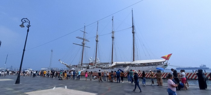 Veracruz, Ver.- (AVC/José Juan García) Cientos de veracruzanos y de visitantes llegaron al muelle de la "T" en el viernes santo para visitar el buque escuela de la Armada de España, Juan Sebastián de Elcano, el cual se encuentra atracado en el puerto de Veracruz desde el 31 de marzo. El bergantín-goleta abrió sus puertas al público a las nueve de la mañana y ya había decenas de personas esperando que se les permitirá el acceso. Arturo y su familia, quienes residen en esta ciudad, tardaron más de una hora para abordar el buque escuela español. Él comentó que ya ha visitado el buque escuela Cuauhtémoc, pero aseguró que se trató de la primera vez que conocería el Juan Sebastián de Elcano. "Me enteré por las redes, voy a subir para conocerlo bien, ahorita que vino hay que aprovechar", expresó. De igual forma, Ángel y su familia aprovecharon el viernes santo para conocer el buque escuela de la Armada española. Los veracruzanos intentaron abordar la embarcación el jueves por la tarde, pero se acabó el horario de la visita, quedándose con las ganas, motivo por el cual se programaron para la mañana del viernes. "Mi hija me dijo que estaba aquí y aprovechamos", añadió. No solo veracruzanos llegaron al muelle de la "T". Karen, originaria de Puebla y quien se encuentra de vacaciones en este destino turístico, llegó la mañana del viernes para abordar el Juan Sebastián de Elcano. La joven se dijo emocionada porque sería la primera vez que subiría a la embarcación española. "Está padre, está interesante, ya llevo como media hora, va avanzando despacito, vine un ratito, a ver qué tal." También Adán, quien es del estado de Coahuila, y su novia colombiana acudieron al muelle turístico para abordar el buque escuela. "Desde antier lo vi, en la noche se ve rojo y dije vamos a visitar a ver qué tal." Cabe recordar que el buque escuela Juan Sebastián de Elcano abrirá sus puertas este sábado a partir de las nueve de la mañana y que zarpará del puerto de Veracruz el domingo 5 de abril.