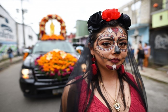 2019-11-01.- Agradecidos por los favores recibidos, los fervientes adoradores a la Santa Muerte realizaron una procesión por las calles de Coatepec, y colocaron un arco floral en el panteón municipal, como una ofrenda a la deidad que los acompaña noche y día.