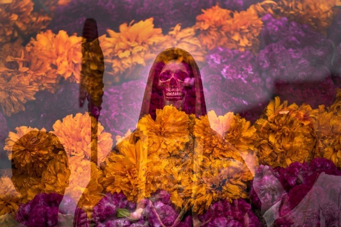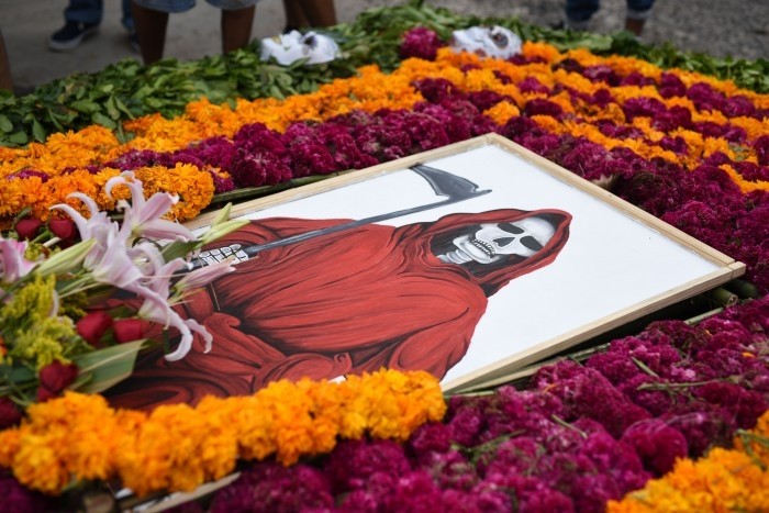 Eran seis nichos, todos adornados con flores blancas, de cempasúchil y mano de léon, y en medio estaba parada la figura de la Santa Muerte, que a su vez, en una mano llevaba una guadaña y en la otra el mundo.